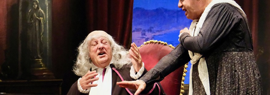 Lo spettacolo si sviluppa su una direttrice di racconto ben delineata, alternando i momenti comici di interazione tra il bizzarro Monsignor Perrelli (Lamberto Lambertini) e la sua serva Meneca (Peppe Barra), agli intermezzi musicali a cura di Luigi Bignone ed Enrico Vicinanza che contribuiscono a dare personalità alla nuova messinscena. Ed è proprio nell’alternarsi del recitato al momento musicale che la pièce suscita l’interesse dello spettatore, creando un rapporto di coerenza tra la recitazione, la comicità ed il canto.