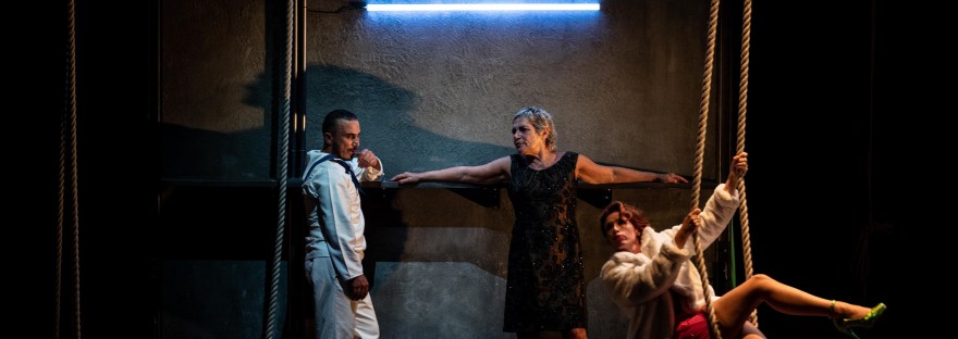 Le verità sono molteplici in questo testo, ed altrettanto le menzogne che si consumano in un tiro di dadi. I marinai si divertono e consumano le loro esistenze in una scena grigia, minimalista, dominata da grandi corde navali su cui questi ultimi si appendono per trovare riposo. Anche in questo caso la suggestione di Corsicato di calare dal soffitto queste grandi corde, attraverso cui si muovono e si dondolano sul palcoscenico i quattro interpreti, pare un’intuizione scenica creativa e assai verosimile alla realtà del mondo portuale. Non da ultimo, la scelta delle musiche, tutte prevalentemente contemporanee e legate al repertorio artistico dell’artista americana Lana del Rey, suggerisce l’interpretazione di un allestimento con una chiara aderenza ai nostri giorni, fortemente evocativa ed artisticamente coerente con il percorso registico proposto al pubblico per questo allestimento.