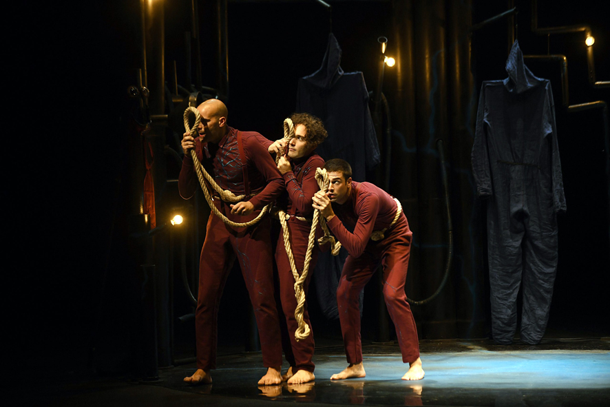 Portare scena questo testo richiede, dal punto di vista tecnico, una profonda coesione tra i tre interpreti in scena, in ragione della coralità dei movimenti, delle battute e dei contesti che si vengono a determinare. Il cordone ombelicale che li lega è rappresentato in palcoscenico da una corda a cui tre sono legati per l’intero spettacolo, fino al punto di distacco allorquando è ormai prossima la fase della loro nascita. La complicità in scena si avvale infatti sia di una componente evidentemente leggera, nel momento in cui i tre danno sfogo delle loro inimmaginabili capacità intellettuali attraverso quiz matematici e gare di poesia, sia di una componente drammatica, ben presto resa nota allo spettatore, in cui si palesa l’incapacità dei tre embrioni di evitare questo processo di evidente riduzione delle loro capacità intellettive.