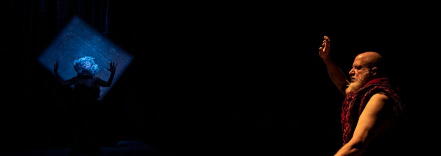 Si accede in sala dopo la breve introduzione e le sedute per gli spettatori incorniciano la scenografia di Antonella Romano. Un’isola deserta costituita da due tonnellate di sale, una lamiera di ferro arrugginita dà voce a maremoti, fulmini e saette, ma anche ai timori e agli incantesimi. Qui vi abitano Prospero, duca di Milano (Massimiliano Foà), sua figlia Miranda (Paola Zecca) e lo schiavo Calibano (Luca Iervolino). Una vasca da bagno sulla sinistra della scena diviene il portale di due mondi: il rifugio di Miranda, ma anche la prigione dello spirito Ariel (Paola Zecca), costretto come Calibano alla schiavitù.